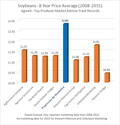 Progressive Ag Marketline has been one of the top US marketing advisory services since 2001 for corn and soybeans as rated by AgMas (a USDA sponsored study), as well as from Farm Journal’s AgWeb-TopProducer magazine. Visit the marketing page and see our official rankings. The AgWeb-Top Producer independent study included top ranking market advisory firms selected by AgWeb-Top Producer that covered marketing years from 2008–2015 **.